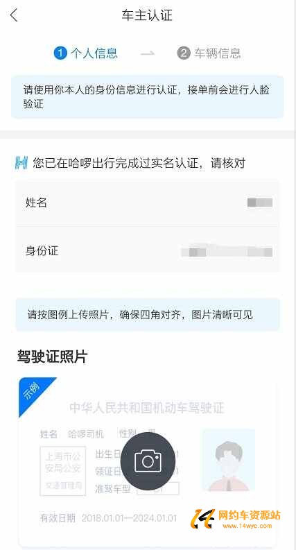 3、进入车主认证界面后,根据提示填写个人信息“姓名”“身份证”,并上传“身份证照片”,填完个人信息后,点击“下一步”;