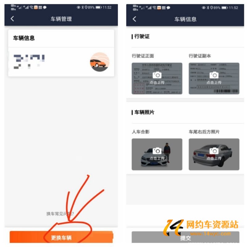 2、进入车辆信息界面后,点击“更换车辆”,添加符合条件的车辆后,按要求上传行驶证和车辆照片后,提交等待平台审核即可。