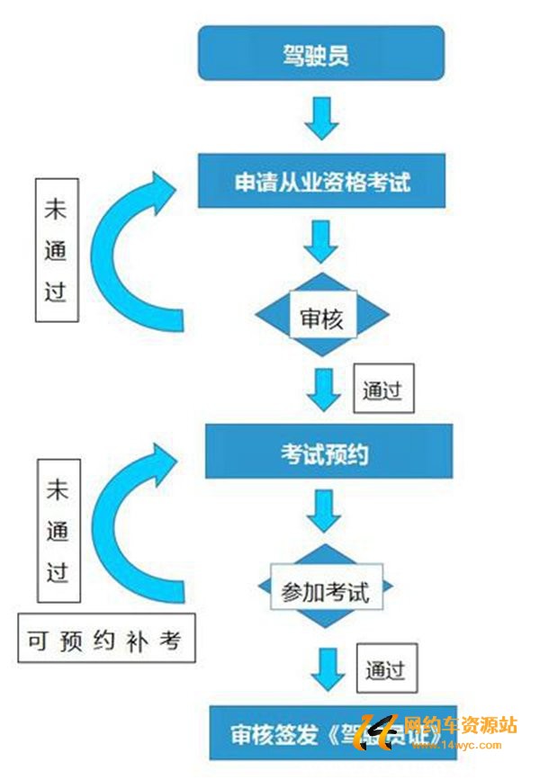 网约车资格证考取流程分6步:“网上报名-网上预约-现场确认和约考-参加考试-查询成绩-现场领取网约车资格证”。