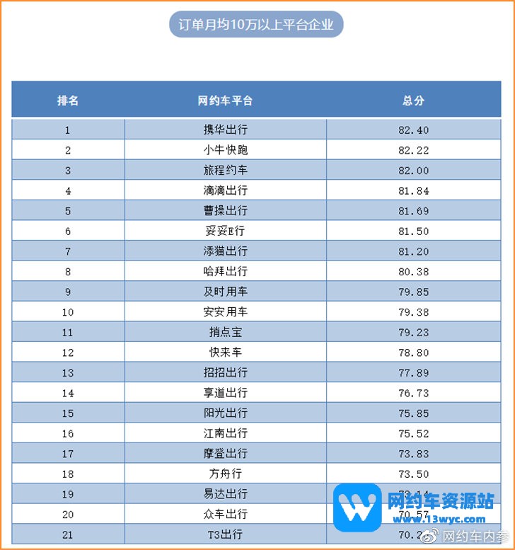 杭州对在当地实际运营的43家网约车平台企业,按照订单月均10万以上平台企业和订单月均10万以下平台企业两个指标分开进行了排名。