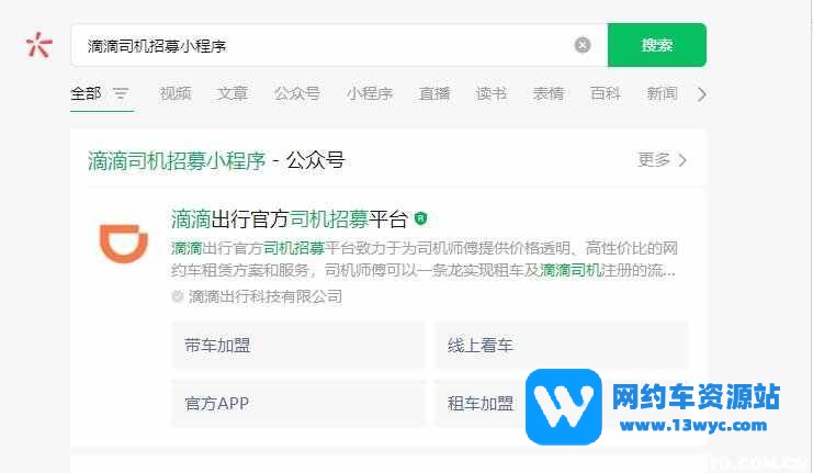 在微信搜索“滴滴出行官方司机招募平台”,进行关注。注册滴滴司机是分类型的,如果是自己带车加入,那么就可以直接申请。如果是选择租用平台的车或购买平台的车,那么就需要先填写资料,等工作人员联系。